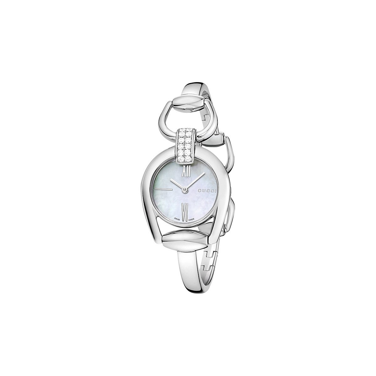 Die Horsebit kleine Armreif-Uhr mit Edelstahlgehäuse in denen sind eingebettete Diamanten, 0.36 insgesamt 12 CT., weiße Perlmutt-Zifferblatt, Stahl Armreif macht jede Frau Arm nur inconfondibilimente