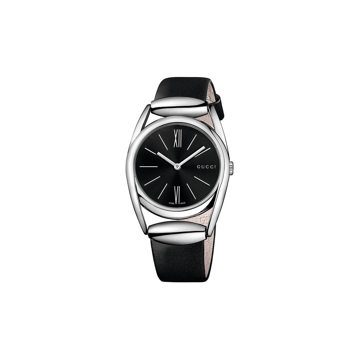 Die Gucci Horsebit klein ist mit Edelstahl ausgestattet und gebürstet, schwarzes Zifferblatt und Lederband