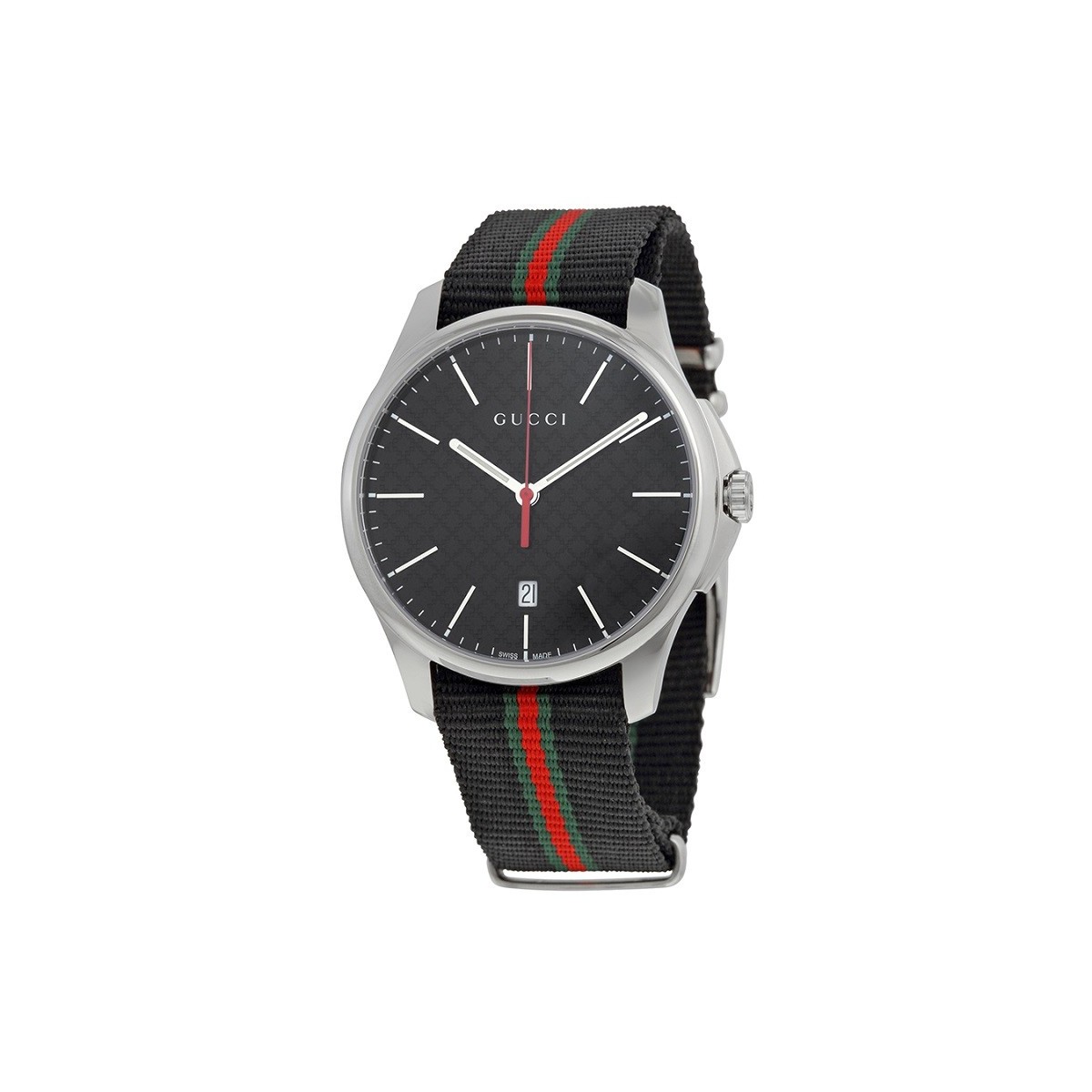 Uhr G-Timeless Linie groß schlank, Gehäuse aus Edelstahl, schwarz mit grün rot grün Web Stoffband, Quarzwerk, schwarzes Zifferblatt Diamant-Muster.