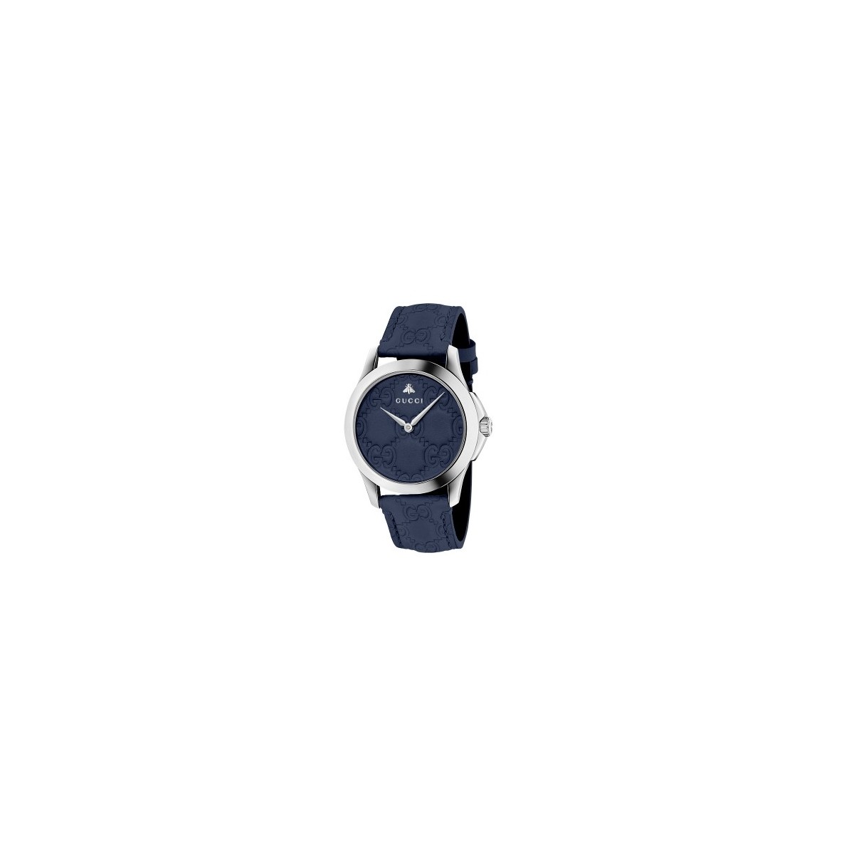 G-Timeless Collection Uhr mit Quarzwerk; Edelstahl-Gehäuse mit glattem Ring, Lederton-Wählton mit Gurt und Bein graviert auf GG-Leder. Biene und Unterschrift Gucci im Zifferblatt