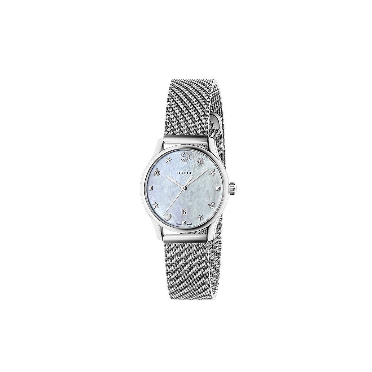 Damenuhr G-Timeless Slim Kleiner Quarz mit Stahlkoffer, Perlmutt Zifferblatt mit Indizes Biene Herz Stern Herz und Milan Stahl Mesh Armband.