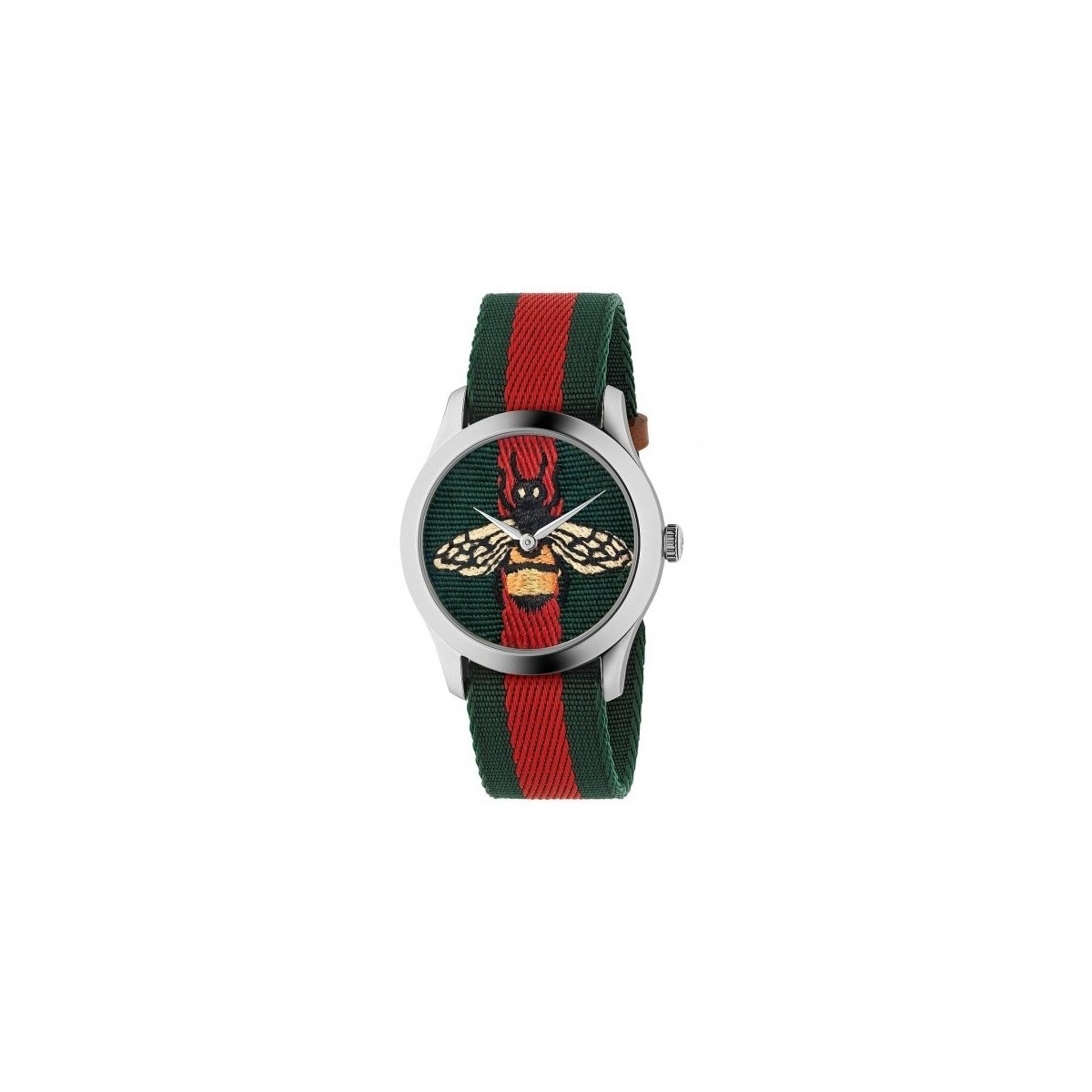 Diese G-Timeless-Uhr zeichnet sich durch eine Idee der Kontinuität aus, da sich das grün-rote Webmotiv, das das Armband definiert, im Zifferblatt fortsetzt und durch eine in der Mitte gestickte Biene bereichert wird.