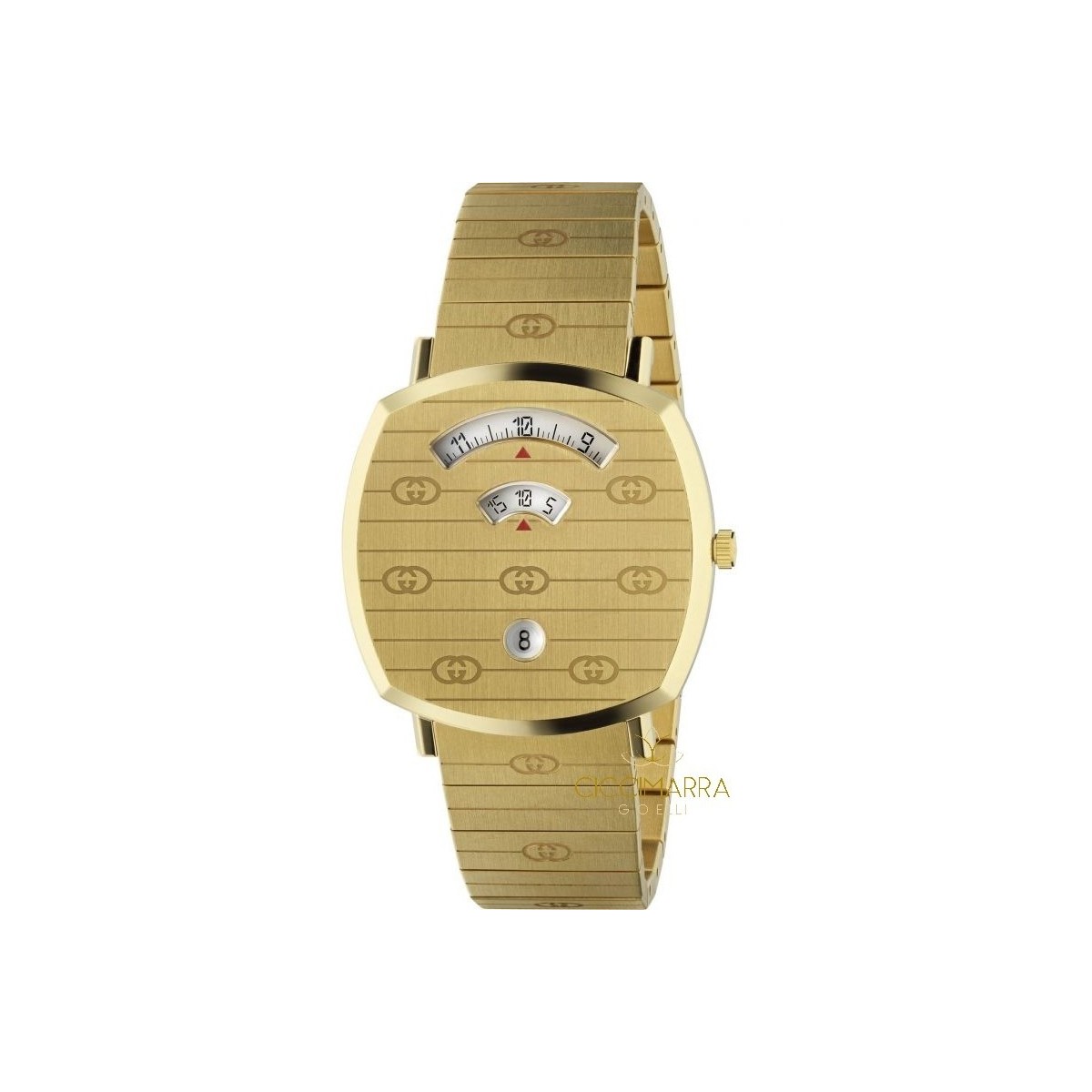 PVD-Gehäuse aus Gelbgold mit graviertem GG-Motiv, 3 Öffnungen für Stunden, Minuten und Datum, PVD-Gelbgoldarmband mit GG Ronda-Quarzwerk Wasserdicht bis 3 ATM (30 m) Referenz: YA157409 Gehäusedurchmesser: 38 mm Swiss Made und International Garantie 2 Jahre