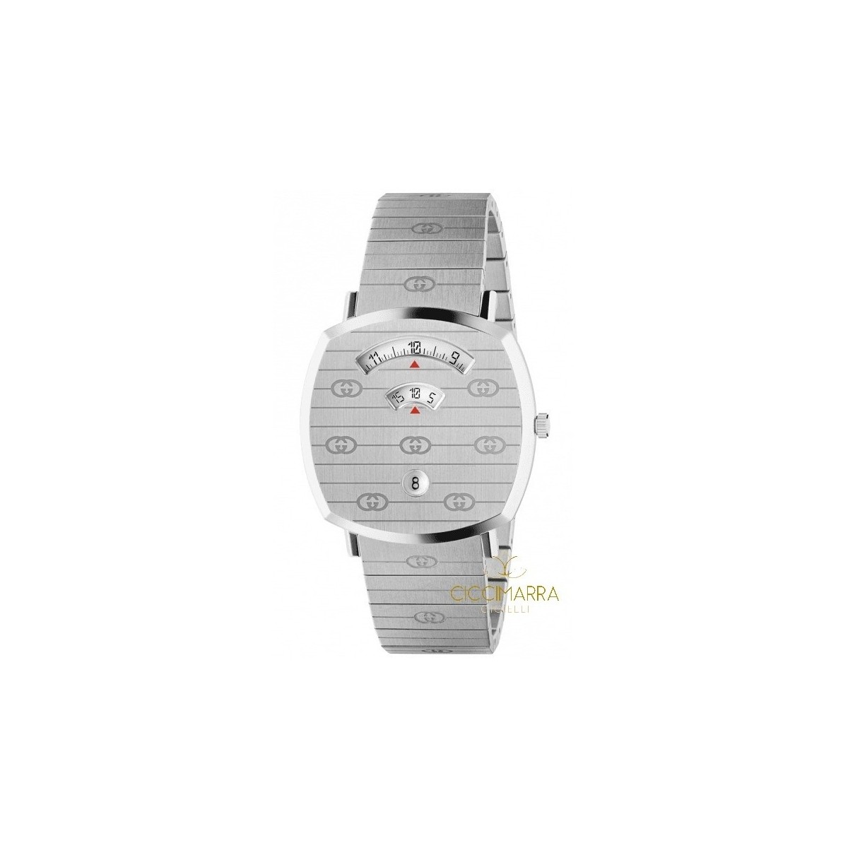 Stahlgehäuse mit graviertem GG-Motiv, 3 Öffnungen für Stunden, Minuten und Datum, Stahlarmband mit GG Ronda-Quarzwerk Wasserdicht bis 3 ATM (30 Meter) Referenz: YA157410 Gehäusedurchmesser: 38 mm Swiss Made und internationale Garantie 2 Jahre
