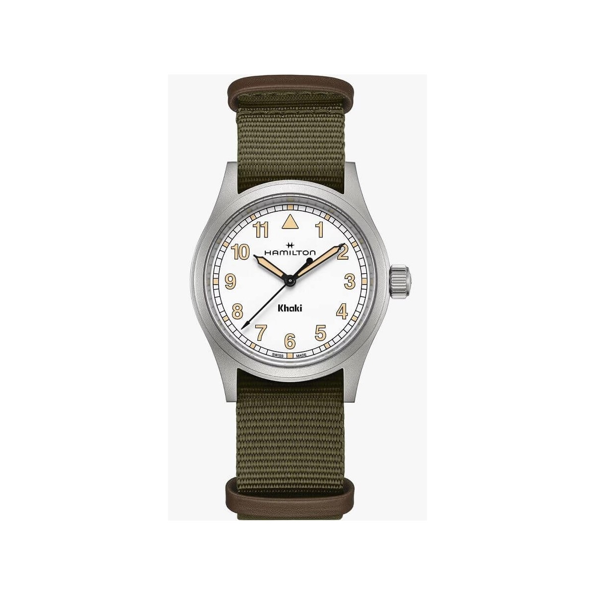 Die Uhr verfügt über das klassische Khaki-Design von Hamilton mit einem weißen Zifferblatt, das dank arabischer Ziffern in einer klaren und linearen Schriftart klar und gut lesbar ist