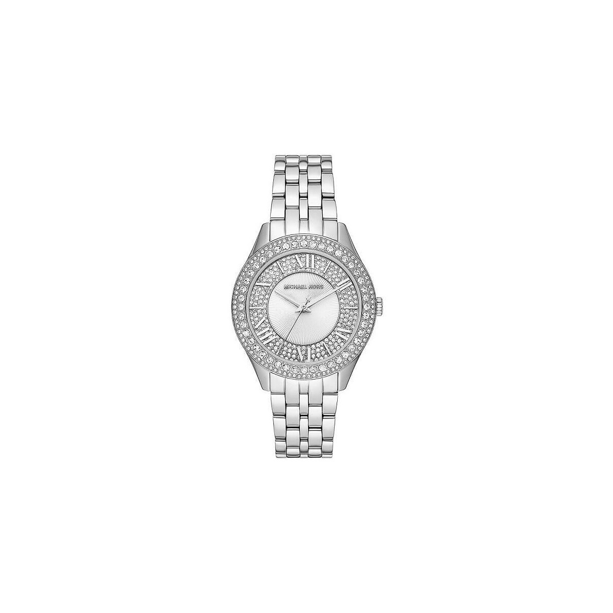 Damenuhr, Linie Harlowe, Quarz. Aus silberfarbenem Stahl, 38 mm Gehäuse mit weißen Zirkonen auf der Lünette und im Zifferblatt. Faltschließe.