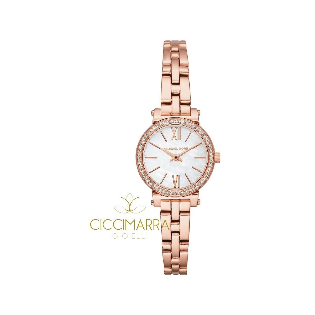 Rundes Gehäuse aus Roségold-Edelstahl mit Kristall-Pavé-Ring und Perlmutt-Zifferblatt mit 26 mm Durchmesser und 7 mm Dicke; Zeiger, Indexe und römische Zahlen sind roségoldfarben. Armband in Roségold Edelstahl 9mm breit, daher extrem elegant und feminin, Faltschließe.