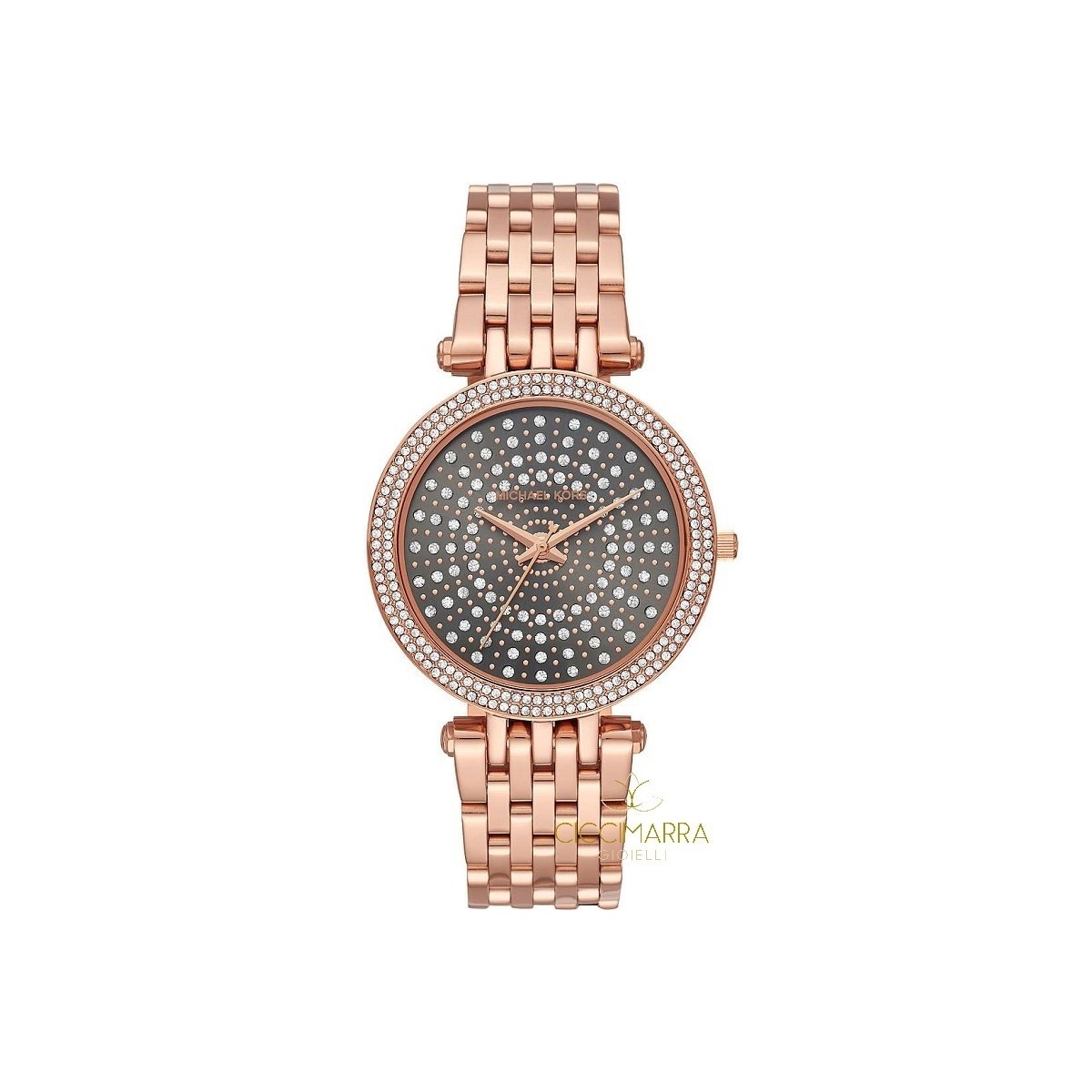 Darci Collection Damenuhr mit Edelstahlgehäuse und Armband in Roségold poliert, schwarzes Zifferblatt mit Kristallen, Quarzwerk