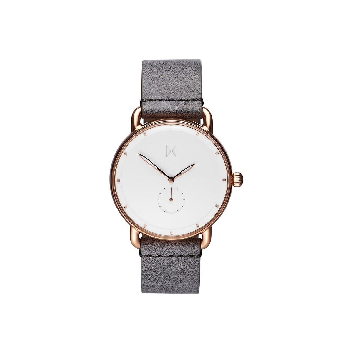 Quarz-Unisex-Uhr mit 41-mm-Rosé-Pvd-Stahlgehäuse, weißem Zifferblatt und glänzendem, grauem Lederarmband - MR01-RGGR