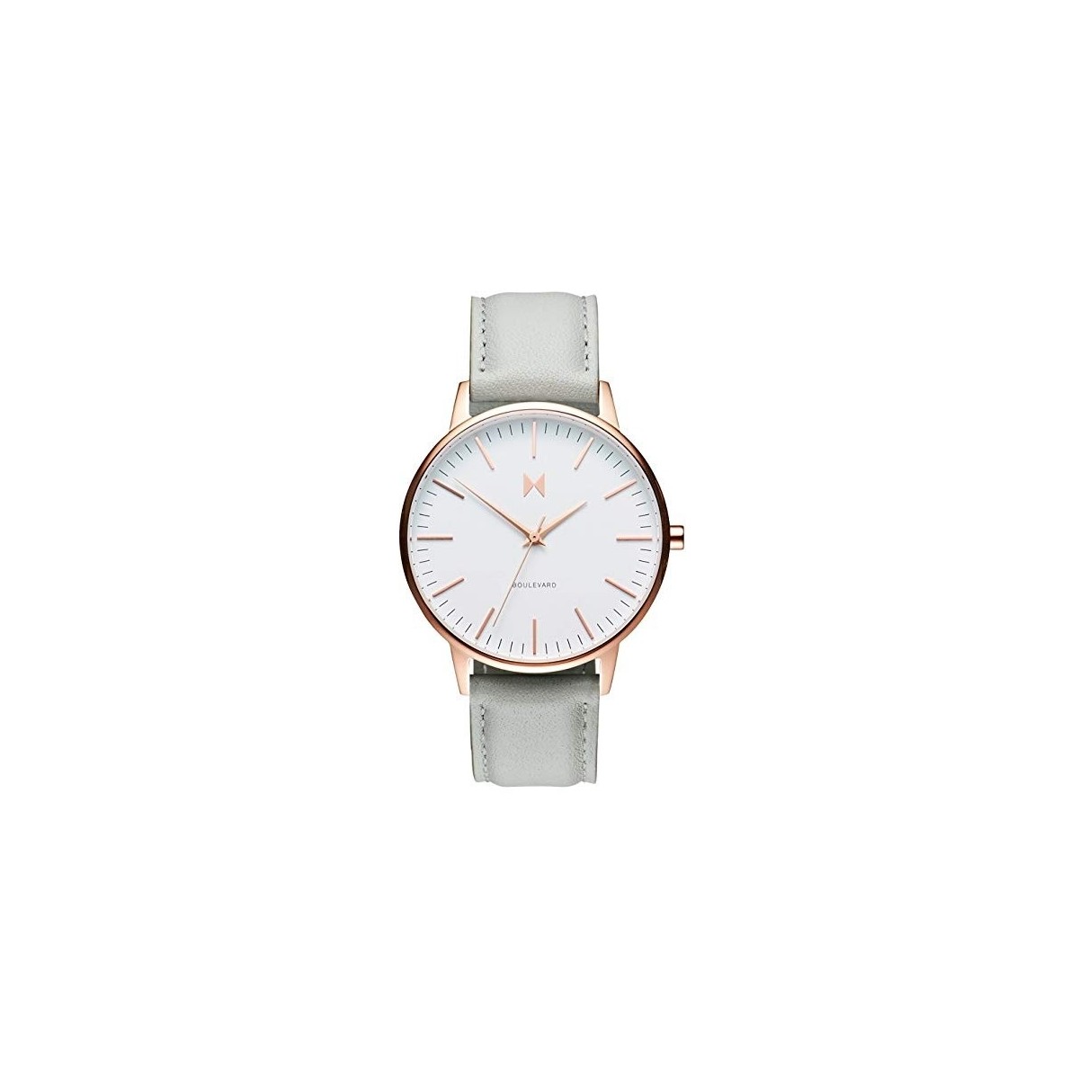 Damenuhr aus Quarz mit 38-mm-Gehäuse aus roségoldplattiertem Stahl, weißes Zifferblatt mit Rosé-Markierungen und Logo und Armband aus Zuckerpapierleder; Ankündigungen