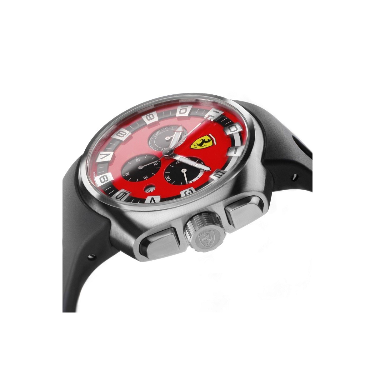 Quarzchronometer des renommierten Automobilherstellers Maranello, sportlicher Charakter und raffinierte Details wie die Form des unregelmäßigen Gehäuses, das rot-schwarze zweifarbige Zifferblatt mit erhabenen arabischen Stahlziffern und das schwarze Kautschukarmband mit Carbonfelgen