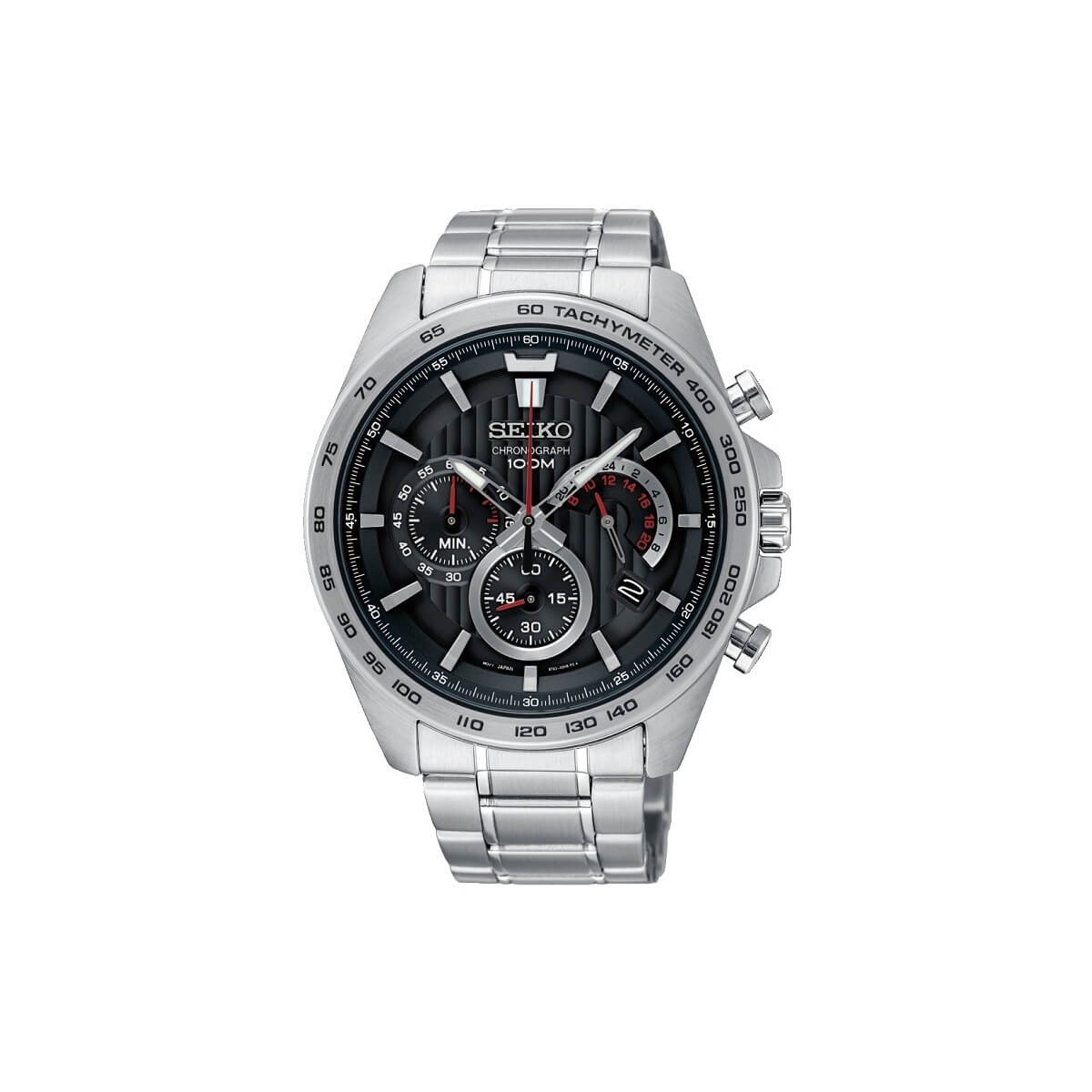 Herrenuhr mit Edelstahlgehäuse und -band, schwarzem Zifferblatt mit weißen Indizes und Zeigern, Datumsanzeige und Chronograph. Glasmaterial: Hardlex; LumiBrite: LumiBrite auf Zeigern und Indexen; Schließe: Dreifachfaltschließe mit Druckknopfverschluss; Wasserbeständigkeit: 10 bar Gehäusegröße: Durchmesser: 44 "; Andere Spezifikationen: Verschraubter Rücken; Tachofunktion; Chronograph bis zu 60 Minuten in Schritten von 1/5 Sekunde, Ausgestattet mit einem kleinen Sekundenzeiger, 24-Stunden-Zeiger. Referenz: SSB299P1
