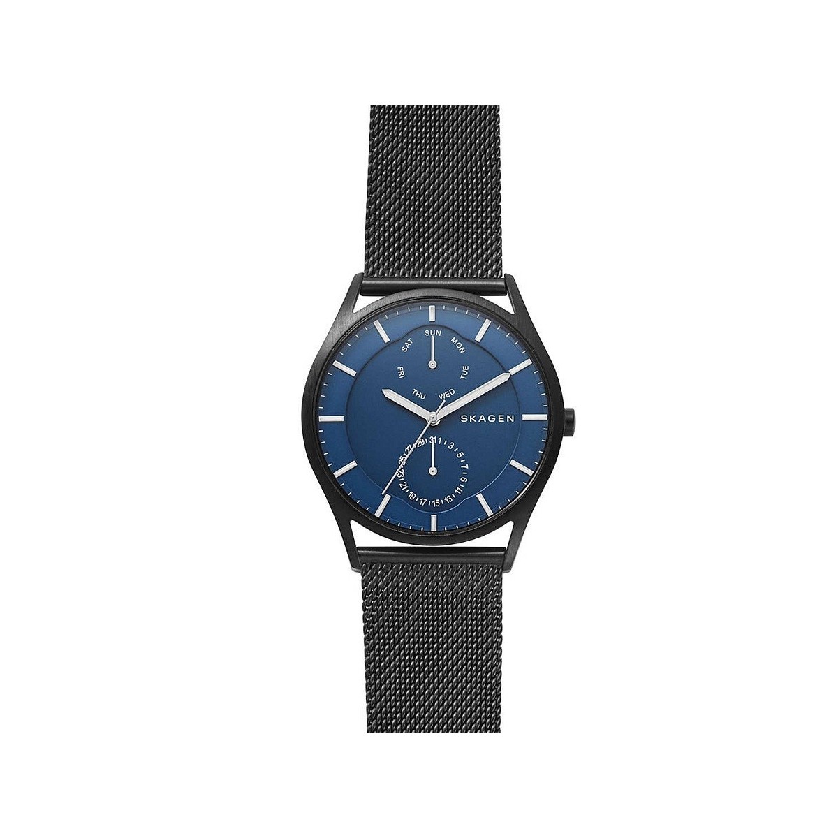 Watch man, Holst Linie, mit Mesh-Armband aus schwarzem PVD-Edelstahl, schwarzes rundes Gehäuse mit satinierter Oberfläche und blauem Zifferblatt mit Gegenkugeln - SKW6450
