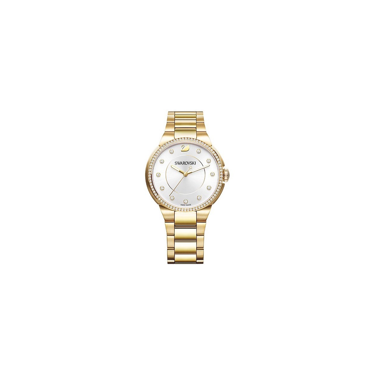 Damenuhr mit Gelbgold-PVD-Stahlgehäuse und -armband und silbernem Zifferblatt mit Swarovski-Kristall-Indexen; 78 Clear Crystal auf der Lünette fixiert