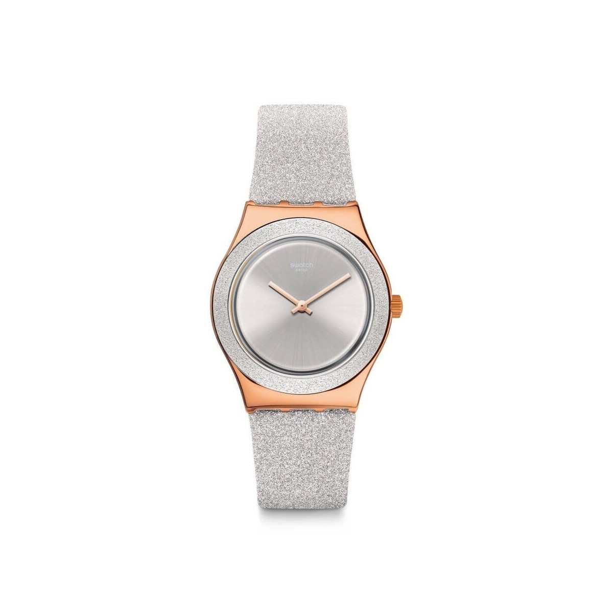 Swatch Grey Sparkle Uhr aus der I Medium Standard Kollektion mit Quarzwerk nur Zeit, 33 mm rundes Stahlgehäuse aus Rotgold PVD und Armband aus Leder und synthetischem Material in Silber mit funkelndem Effekt