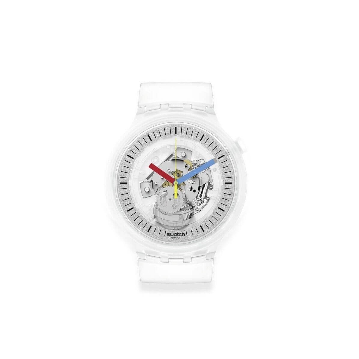 Swatch Unisex Uhr aus der Clearly Bold Kollektion mit Zeitfunktion. Uhr im modernen Stil mit halbtransparentem Silikonarmband, 47-mm-Gehäuse und klarem Zifferblatt mit rot-gelben und blauen Zeigern, die das Quarzwerk durch den silbernen Ring mit schwarzen Indexen anzeigen.
