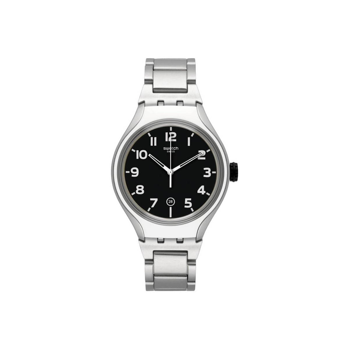 Swatch Stripe Back Irony Aluminium Kollektion mit schwarzem Zifferblatt.