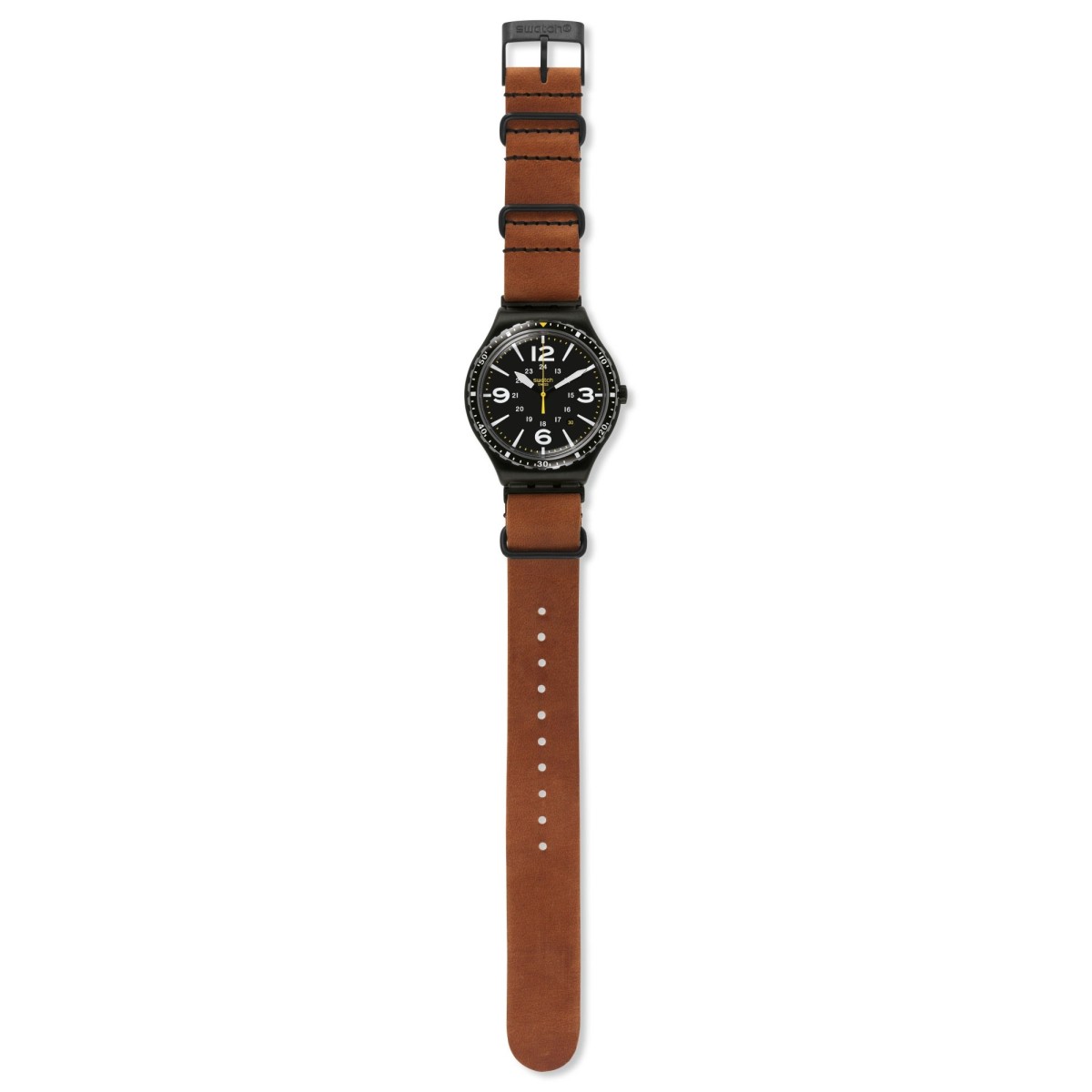 Swatch Uhr Big SPEZIALEINHEIT mit Edelstahlgehäuse und Brown-Leder-Armband, schwarzes Zifferblatt, Quarzwerk für Sport Mann und Abenteurer mit seinen Linien erinnert der Savanne