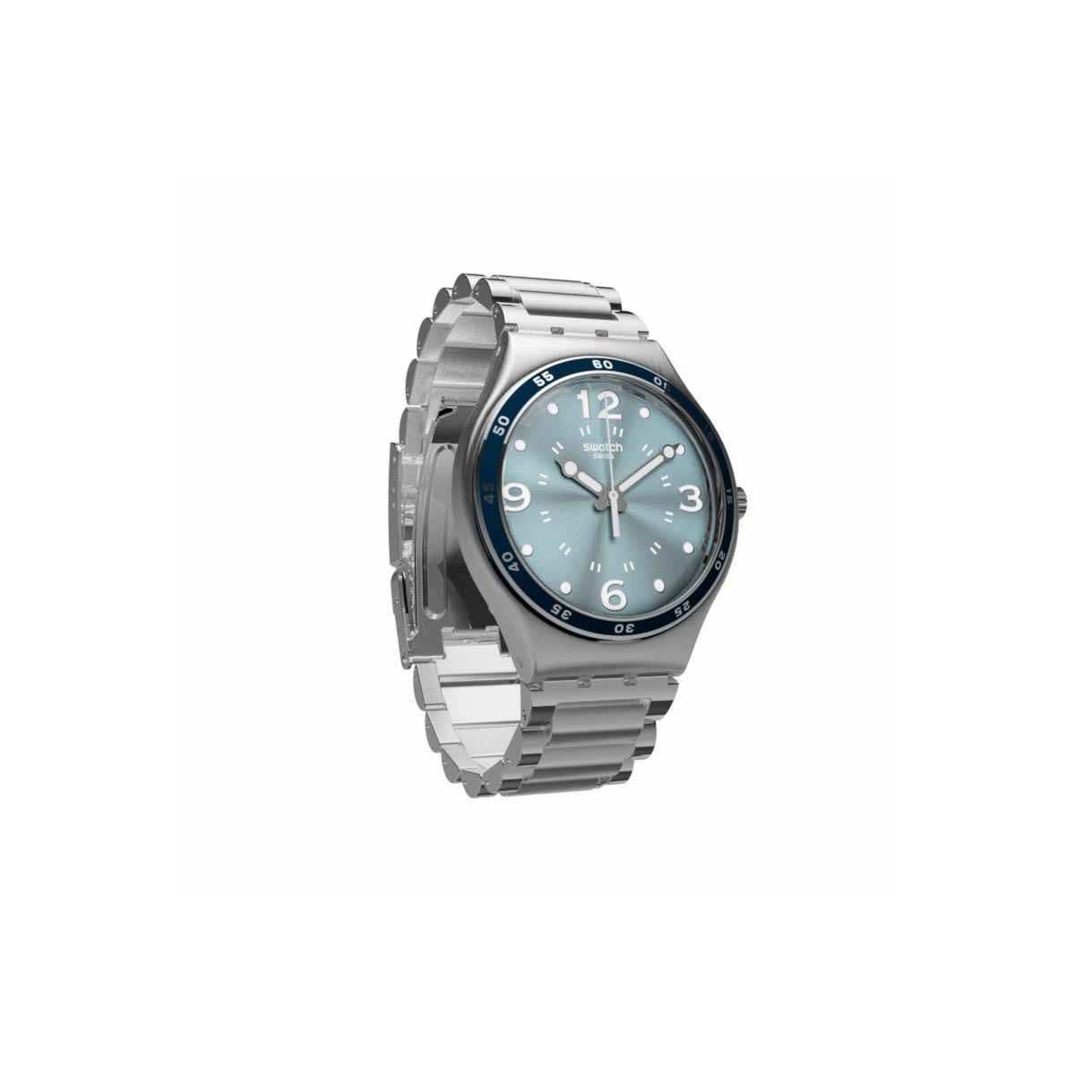 Helles gebürstetes Zifferblatt mit weißen Indizes und Händen mit Superluminova, untergebracht in einem gebürstetem Edelstahlgehäuse mit aufeinander abgestimmter Lünette und dunkelblauen Indizes. Alles ist auf einem verstellbaren Edelstahlband mit gebürsteten Mittelmasten montiert.