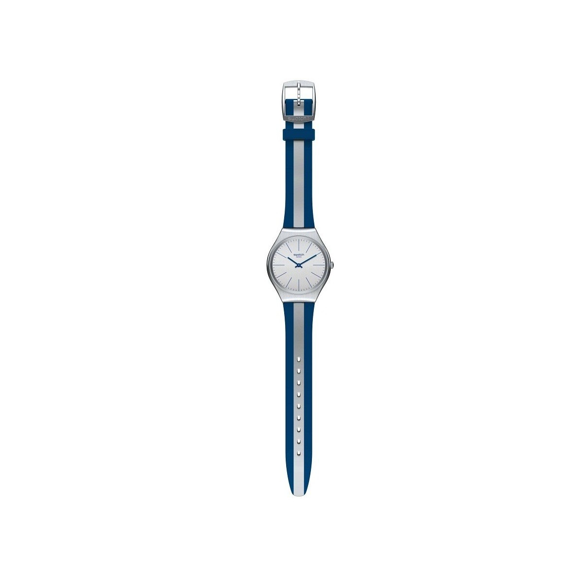Skin SKINSPRING 38 mm Skin Irony Kollektion mit grauem Zifferblatt und blauen Indexen, Edelstahlgehäuse und blau und grau gestreiftem Silikonarmband; Quarzwerk