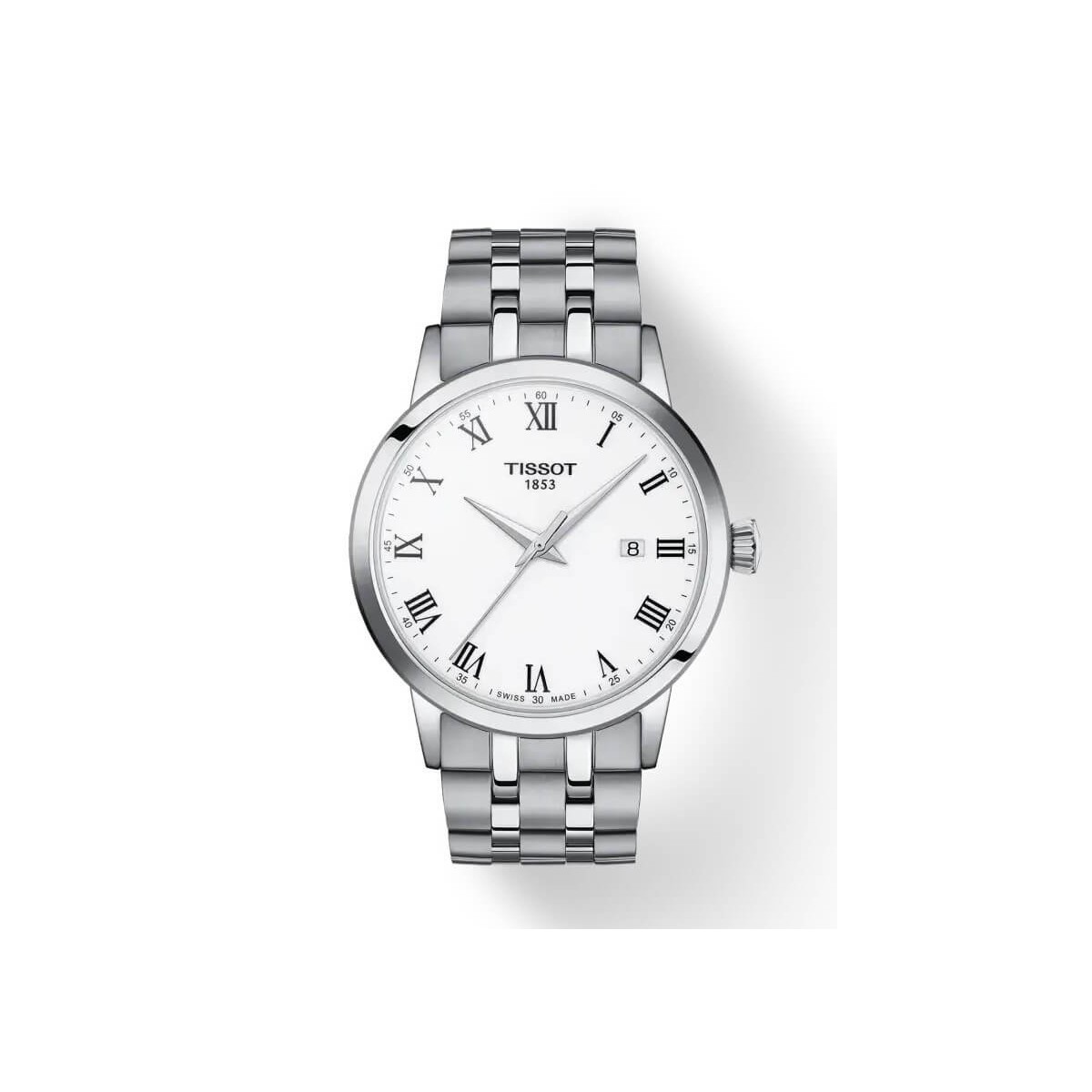 Tissot Herren Quarzuhr aus Stahl der Classic Dream Linie, weißes Zifferblatt mit römischen Indexen und Stahlarmband.