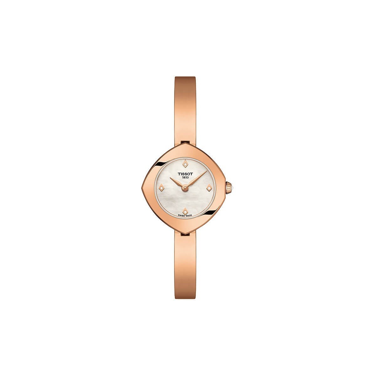 Femini-T Tissot Uhr, aus der T-Lady Kollektion, nur mit Zeitfunktion und Schweizer Uhrwerk, Quarz, aus rosévergoldetem Edelstahl 316L, mit kissenförmigem Gehäuse mit einem Durchmesser von 22,58 mm und gewölbtem, kratzfestem Saphirglas die das weiße Perlmuttzifferblatt mit kleinen Diamanten bei drei, sechs, neun und zwölf Uhr schützt. Tissot mit ihrem eleganten und zeitlosen Stil bestätigt sich als perfektes Accessoire für jeden Stil.
