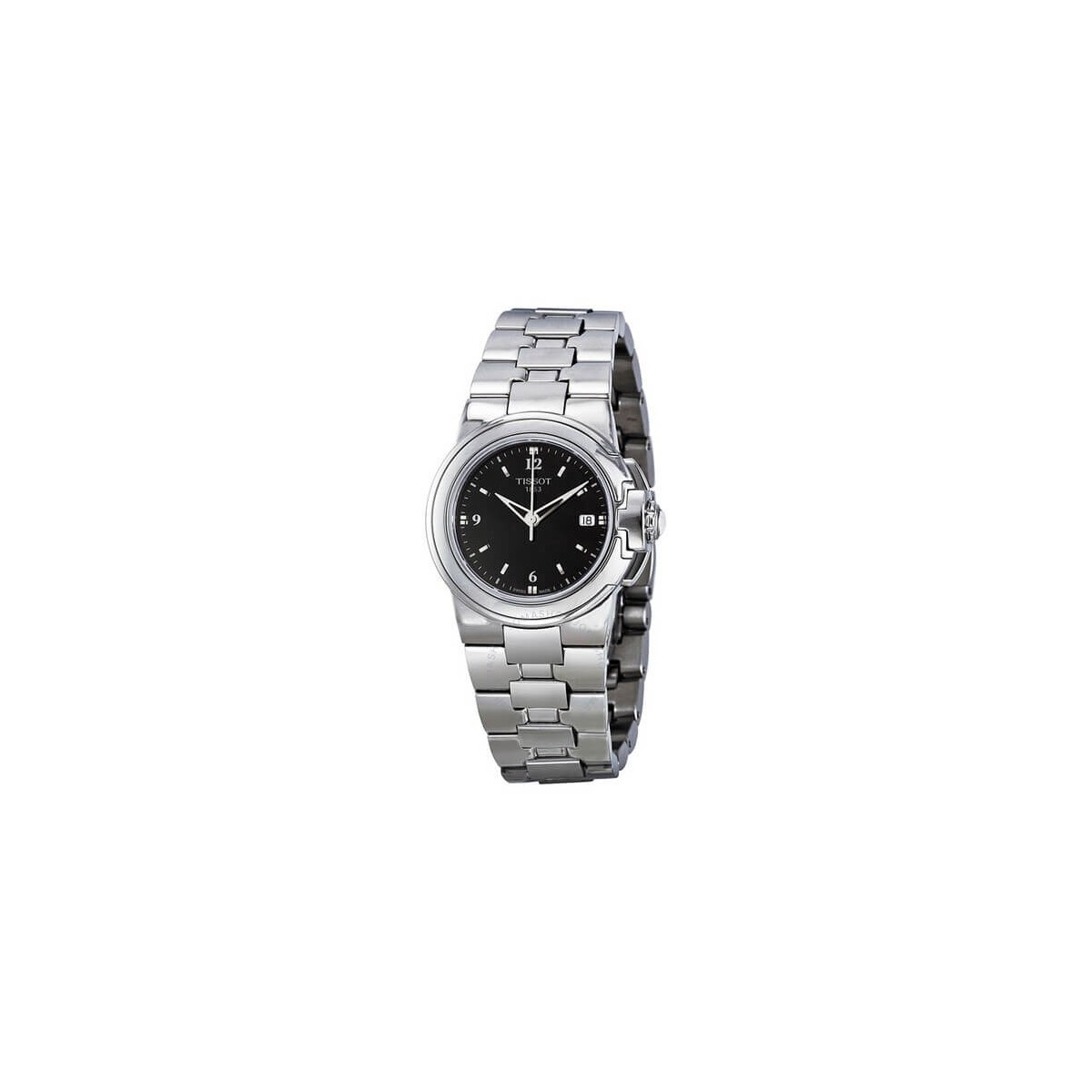 Sport T-Lady Uhr mit reiner Quarzzeitfunktion. Aus Stahl mit Gliederarmband, 32-mm-Gehäuse und schwarzem Zifferblatt. Faltschließe.