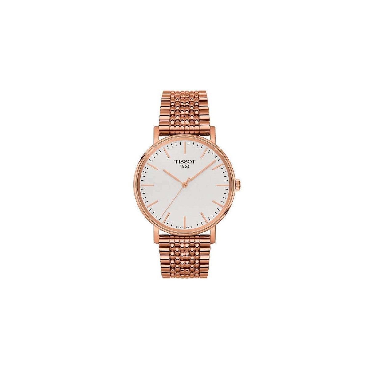 Everytime Tissot Uhr, aus der T-Classic-Kollektion, mittelgroß, mit Zeitfunktion und Schweizer Uhrwerk, Quarz, aus Edelstahl 316L mit Roségold-PVD-Behandlung, mit rundem Gehäuse mit einem Durchmesser von 38 mm und Saphir- und kratzfestem Glas schützt das silberfarbene Zifferblatt mit arabischen Indizes und roséfarbenen Zeigern.