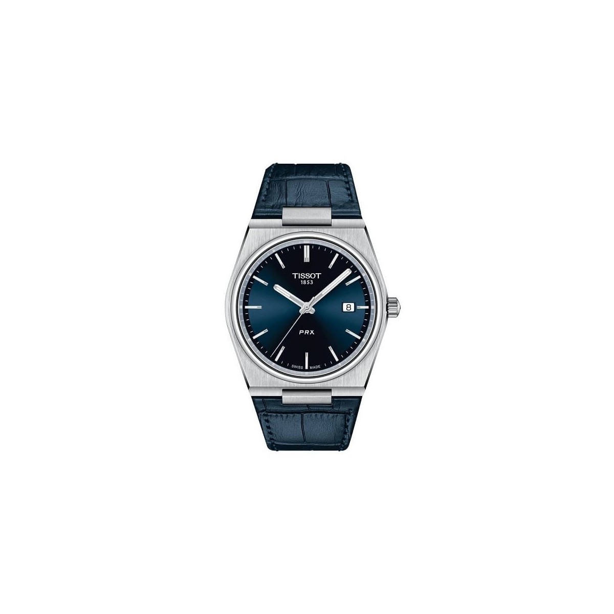 Tissot Herrenuhr aus der Prx-Kollektion mit Zeitfunktion. Die Uhr besteht aus 316L-Stahl mit einem blauen Rindslederarmband mit Alligatordruck, einem 40-mm-Stahlgehäuse, einem kratzfesten und entspiegelten Saphirglas aufrecht und einem blauen Zifferblatt mit SuperLumiNova-Zeigern. Datum bei 3 Uhr und Gehäuseboden mit sichtbarem Uhrwerk.