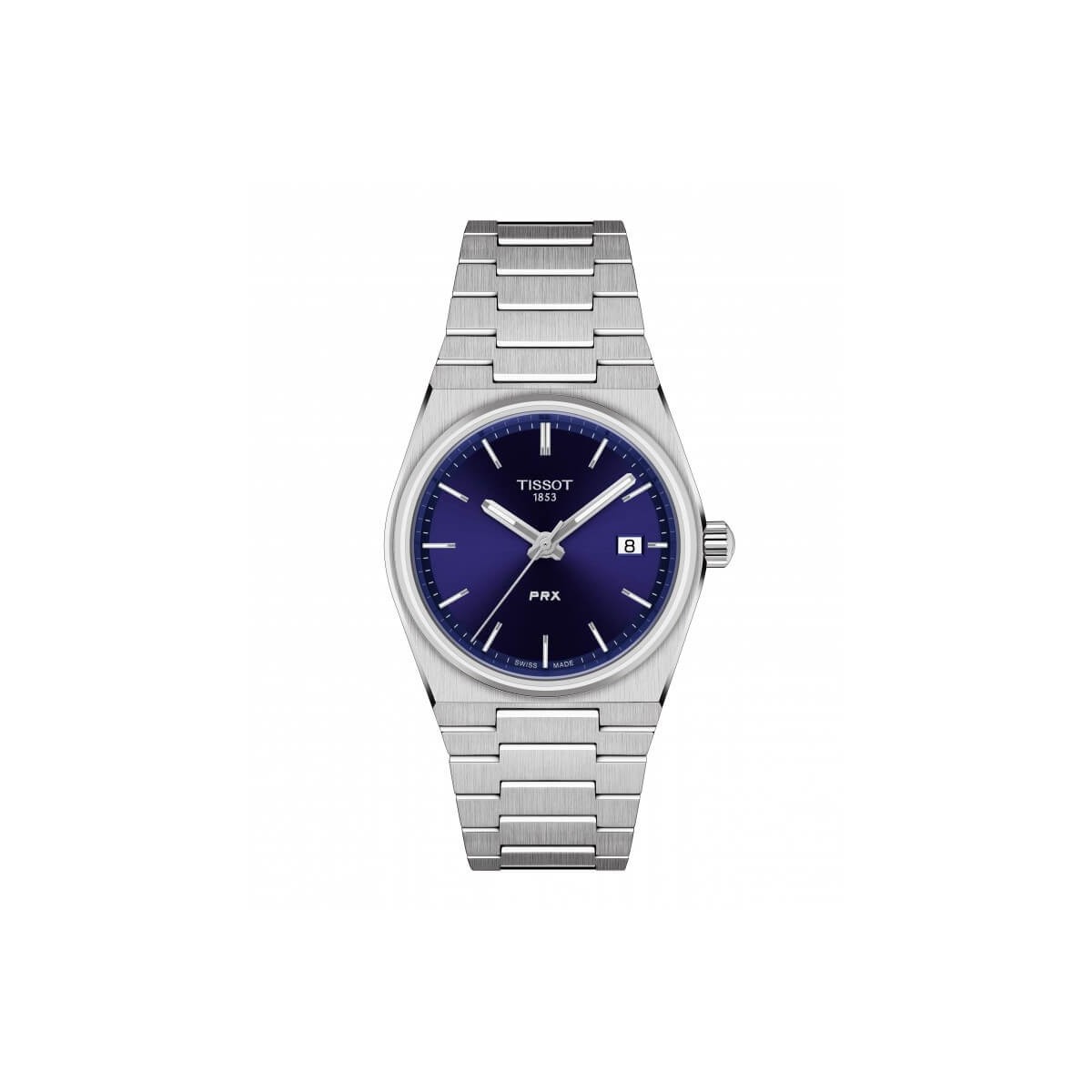 Unisex-Armbanduhr Prx mit Quarz-Zeitanzeigefunktion, Gehäuse und Armband aus Stahl, 35-mm-Gehäuse und blauem Zifferblatt. Schmetterlingsverschluss mit Knöpfen.