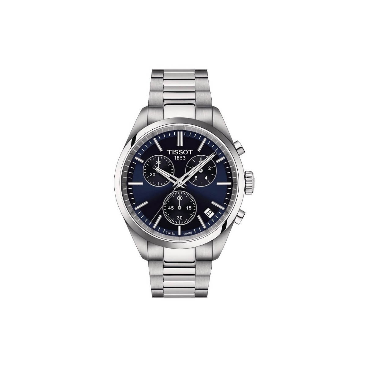 Uhr der Linie PR 100 mit Gehäuse und Armband aus Stahl und blauem Zifferblatt, Quarz-Chronographenwerk, Referenz T1504171104100
