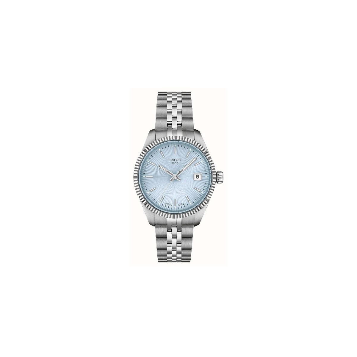 Tissot T-Classic Ballade mit eisblauem Zifferblatt und Stahlarmband.
