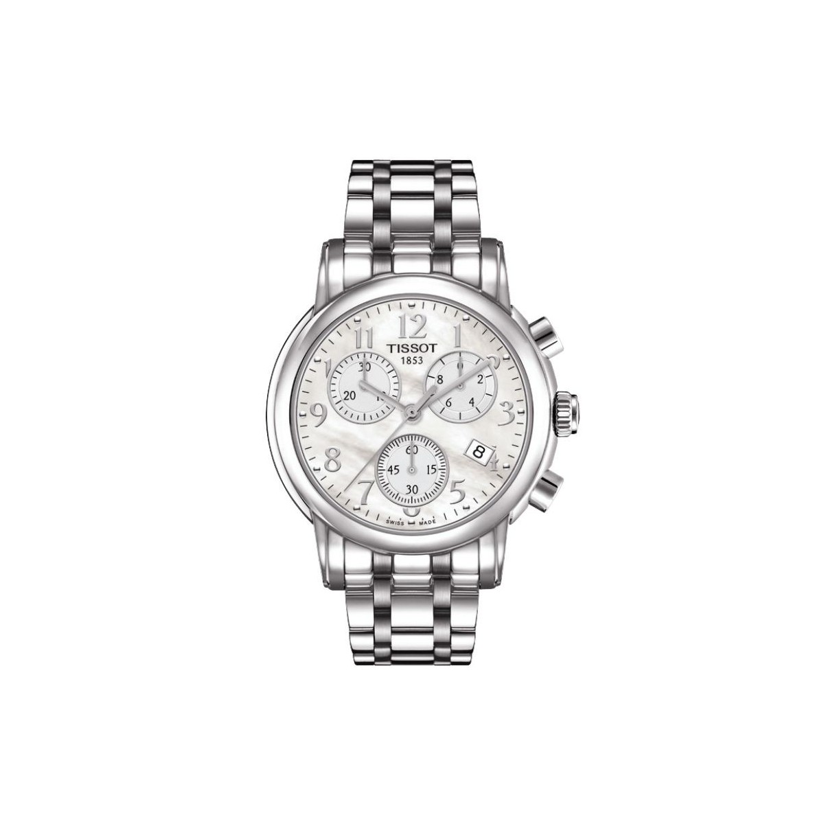 T-Taschenuhr mit Perlmutt Zifferblatt, weißes Lederband Quarzwerk poliert und satinierter Stahl.