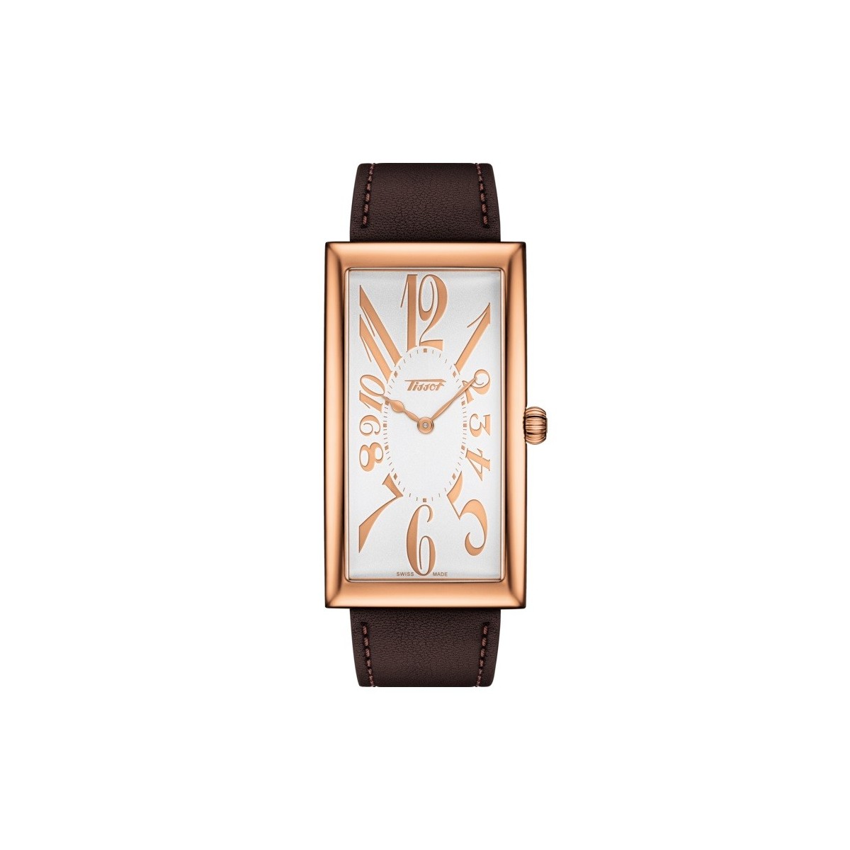Rechteckige Quarzuhr Heritage Banana Centenary Edition mit rosafarbenem PVD-Stahlgehäuse und braunem Lederarmband, silbernem Zifferblatt und goldenen arabischen Ziffern.