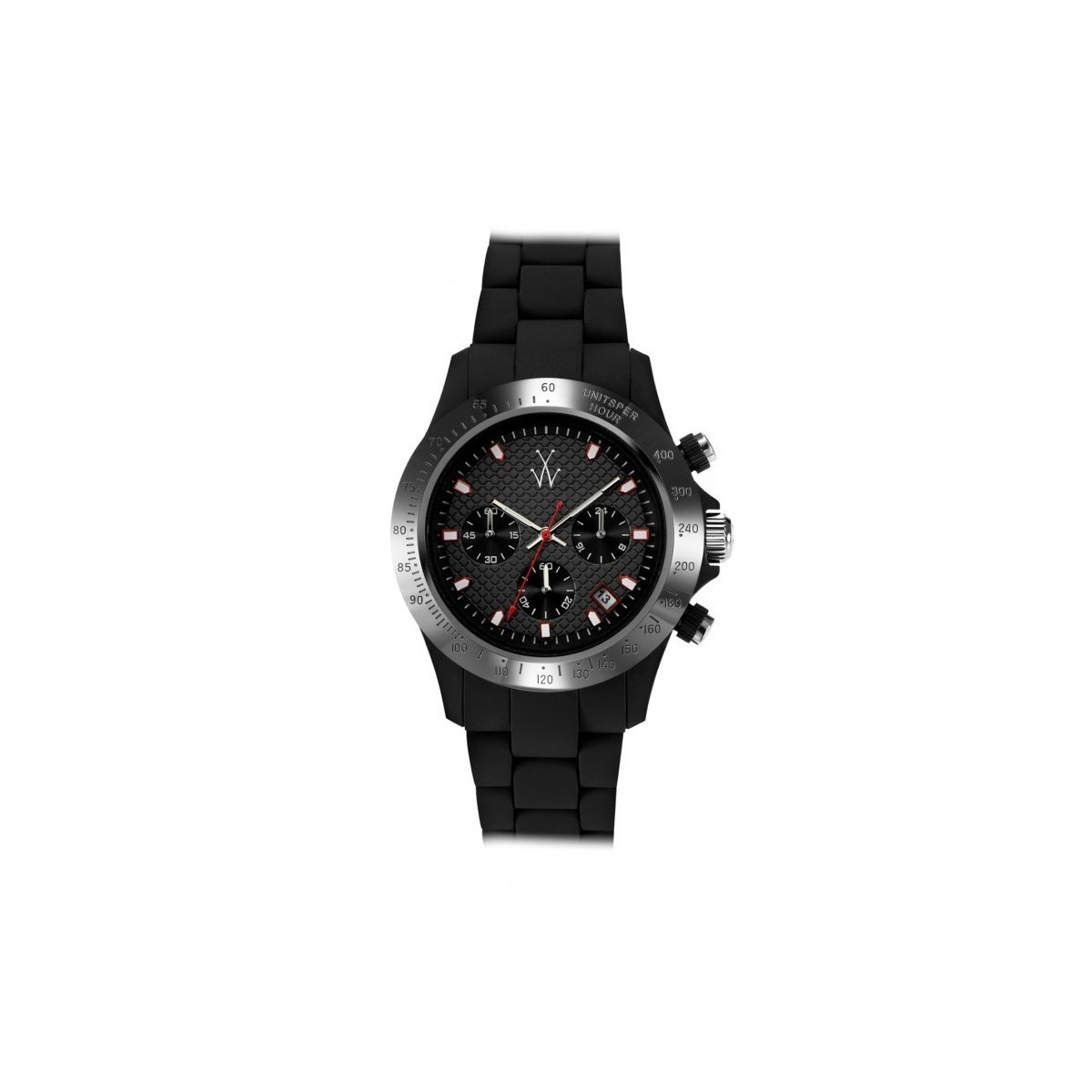 Weiche samtige Note, schwarzes Gehäuse und Armband, schwarzes Zifferblatt mit roten Details, Chronograph Bewegung