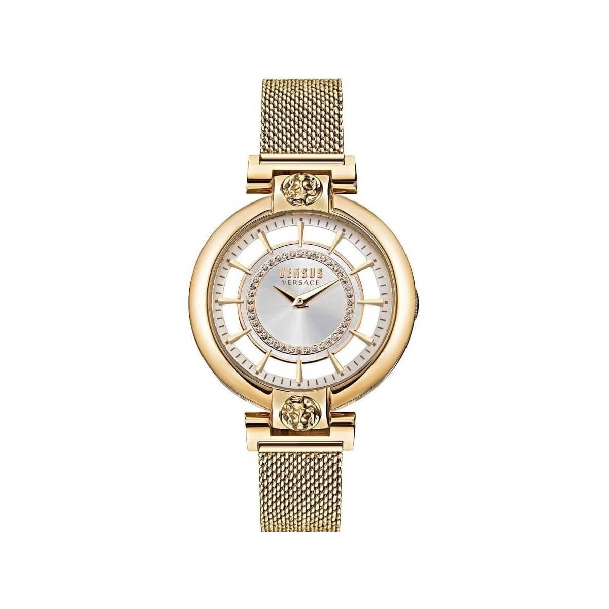 Versus Versace Damenuhr mit goldenem Gehäuse und Milan-Mesh-Armband mit Swarovski-Details im Zifferblatt