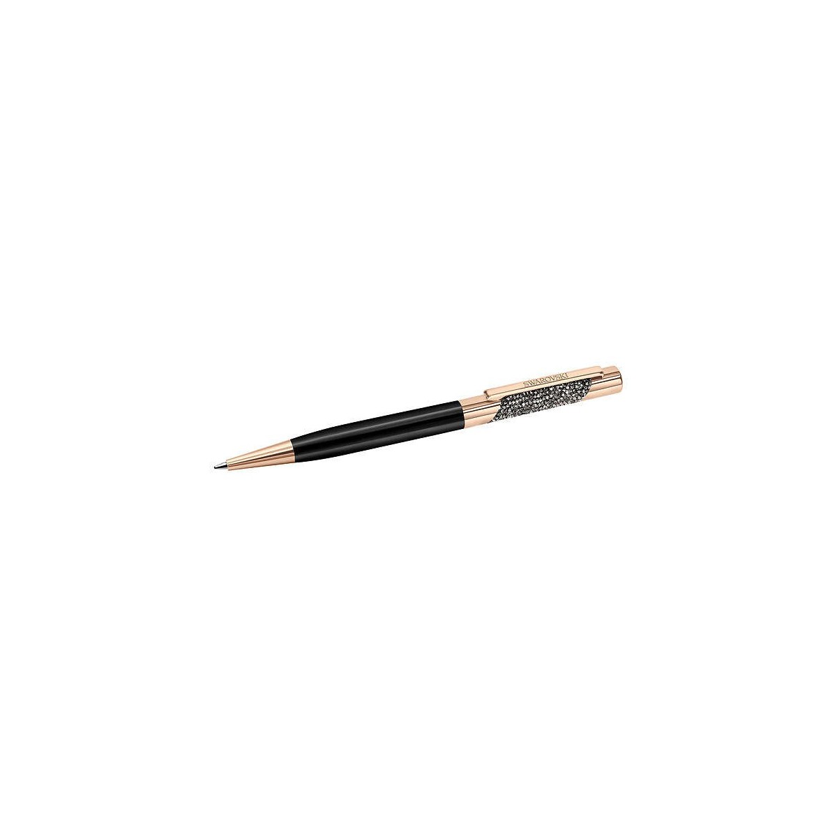 Kugelschreiber mit 520 Black Crystal Rocks, schwarz lackiertem Metallrahmen, Details in verchromtem Roségold Metall und Swarovski Logo Clip
