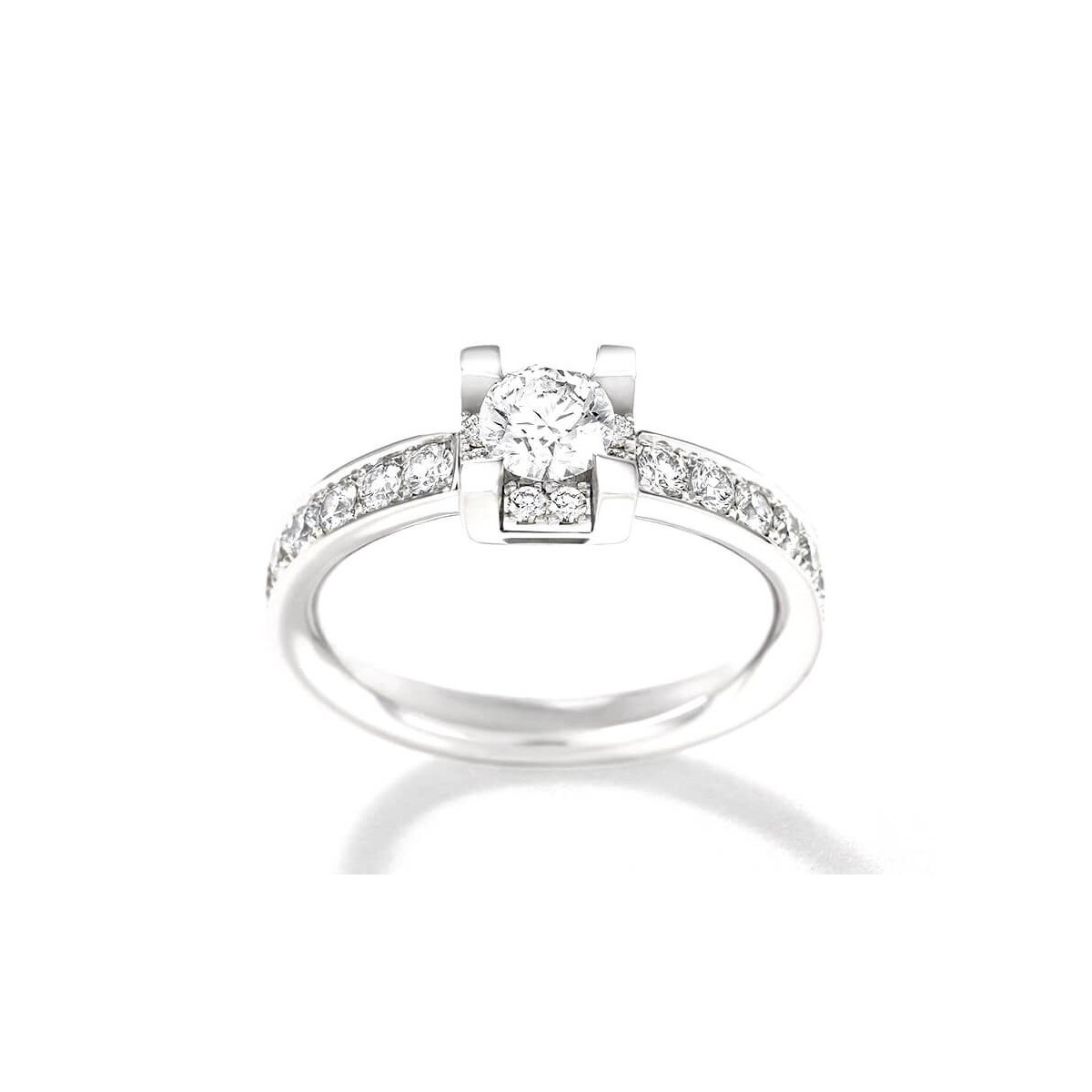Damenring von Giorgio Visconti aus der Io Luce-Kollektion, Solitärmodell mit Kontur, aus 18 Karat Weißgold mit einem natürlichen Diamanten im Brillantschliff von 0,30 Karat in der Mitte und verziert mit einer Kontur aus kleinen natürlichen Diamanten im Brillantschliff auf der Schiene und unter dem Stein 0,22 Karat zentral; für insgesamt 0,52 Karat natürliche Diamanten.