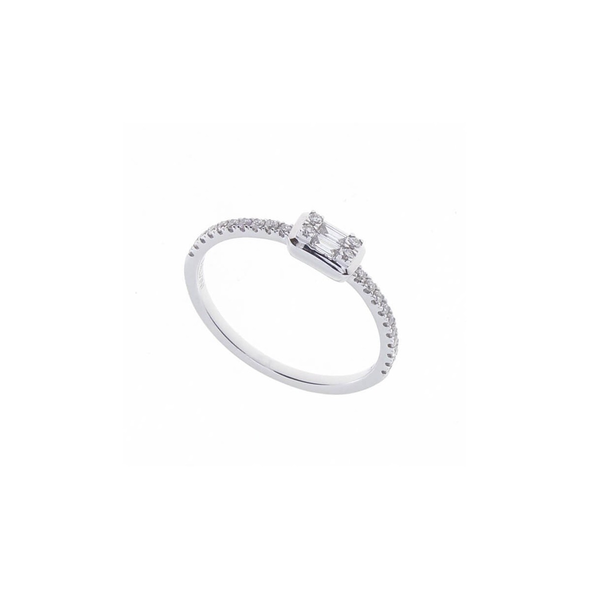 Salvini Solitärring für Damen aus der neuen Kollektion Magia S aus 18 Karat Weißgold mit einem zentralen natürlichen Diamanten im Baguetteschliff von 0,04 Karat, verziert mit kleinen Diamanten im Brillantschliff auf dem Ring von 0,13 Karat.