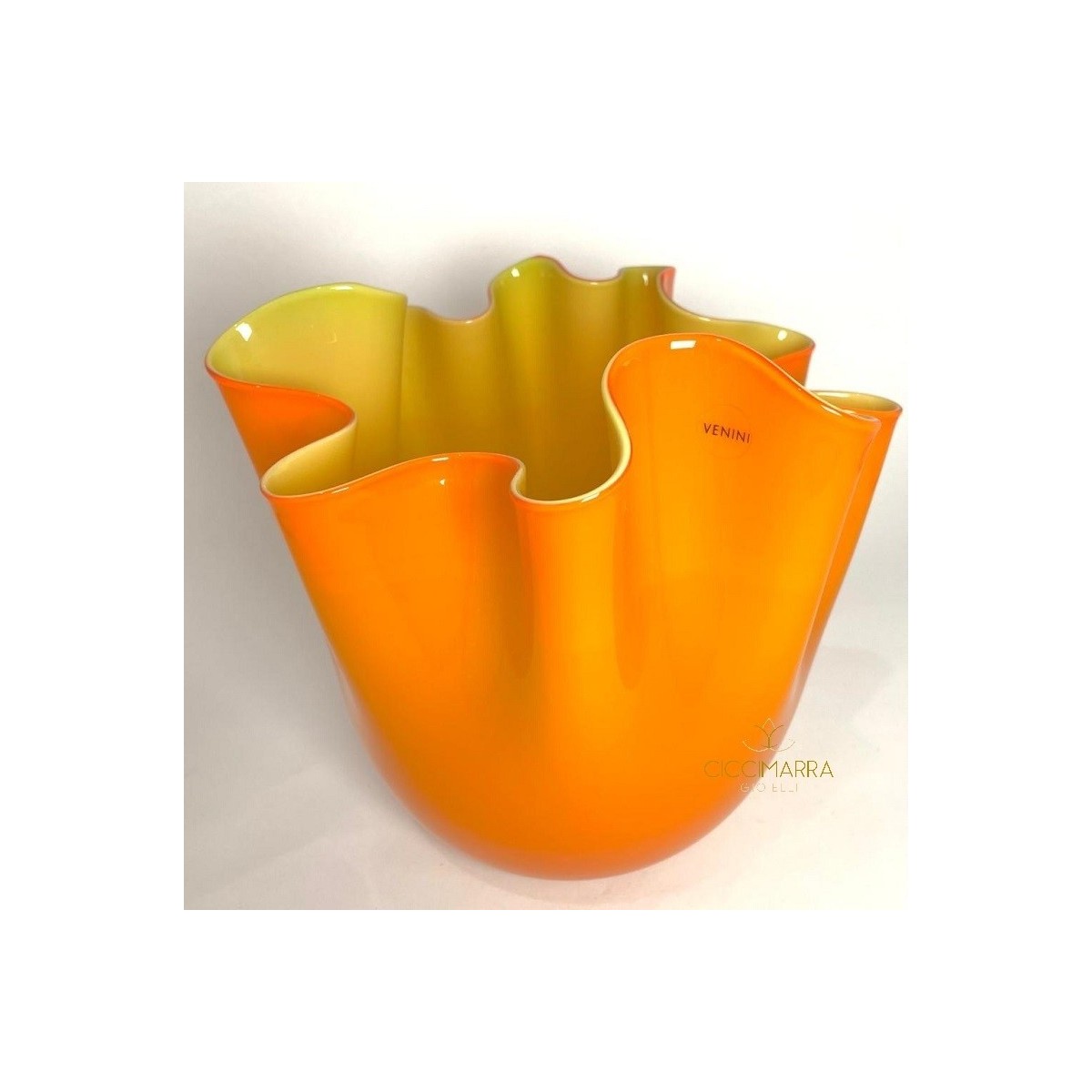 Mittelgroße Vase Venini aus der Fazzoletto-Kollektion aus mundgeblasenem Opalglas, das durch Überlappen der Milch mit anderen Gläsern entsteht und handgefertigt ist, in oranger Farbe mit grüner Innenseite.