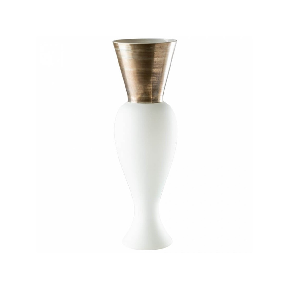 Regina-Vase aus der Re-Regina-Principe-Kollektion aus mundgeblasenem und handgefertigtem Muranoglas, milchweiße Farbe mit Metalleffektoberfläche