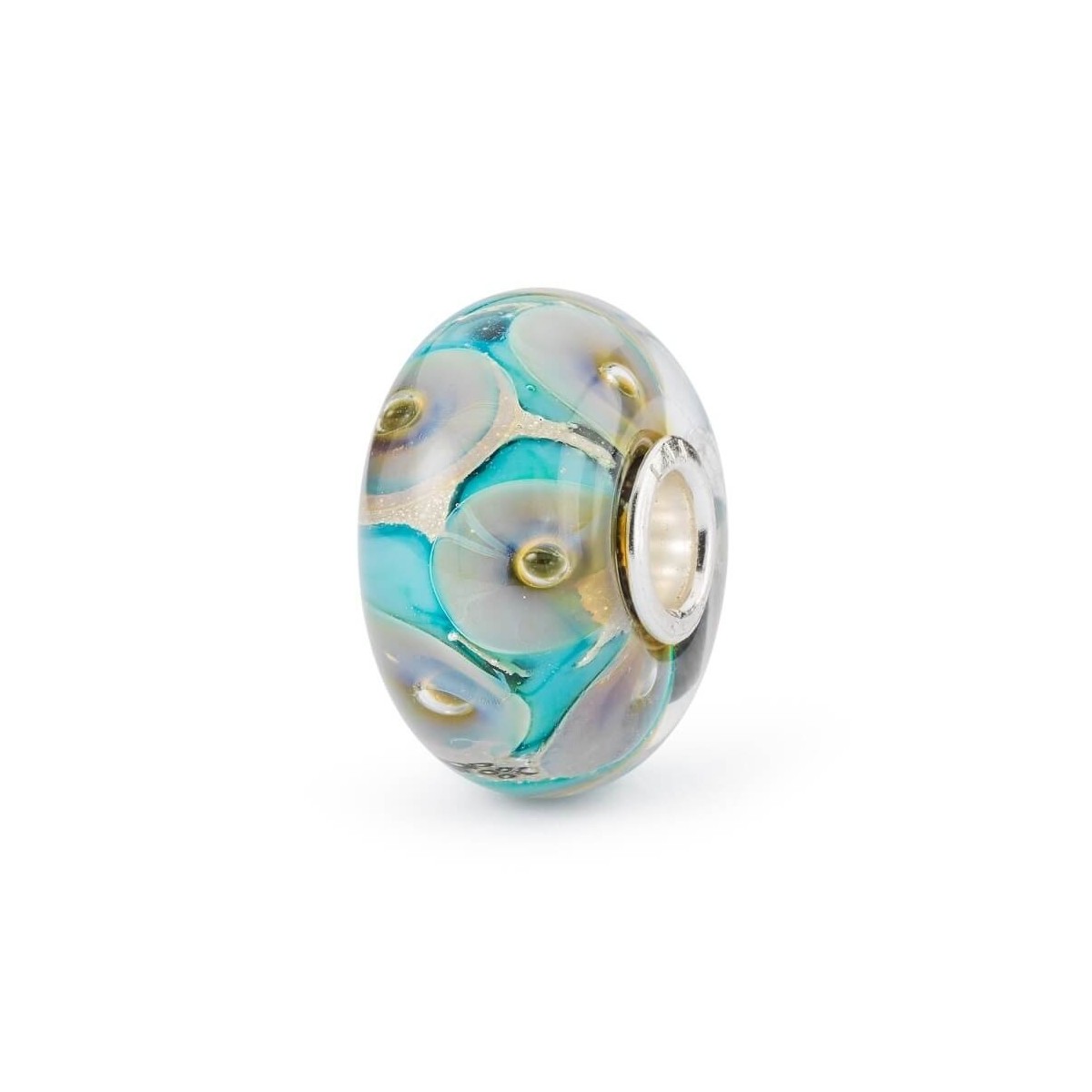 Hellblaue Glasperlen mit Glyzinienarbeit und innerer Silberniete.