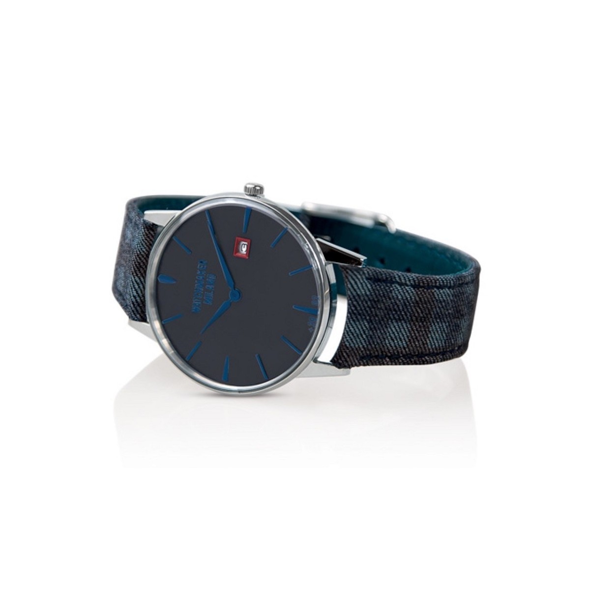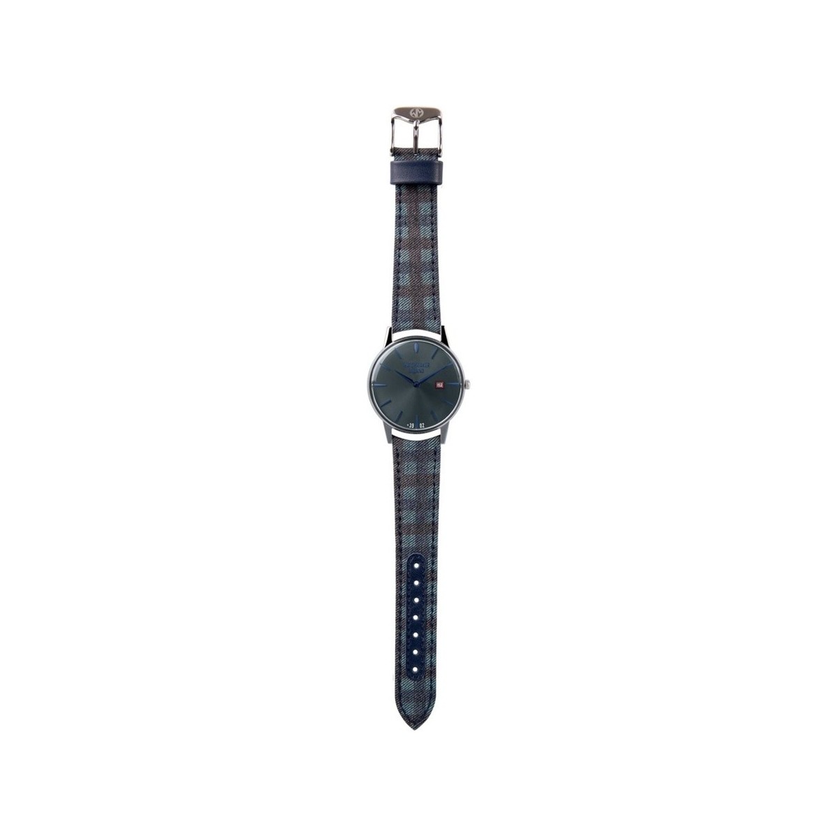 Uhrmacher Milano Ambrogio Linie Weinlese-Uhr mit dunkelgrauem Zifferblatt, Leder und Stoff karierten blauen und grauen Farbband Quarzwerk und dater