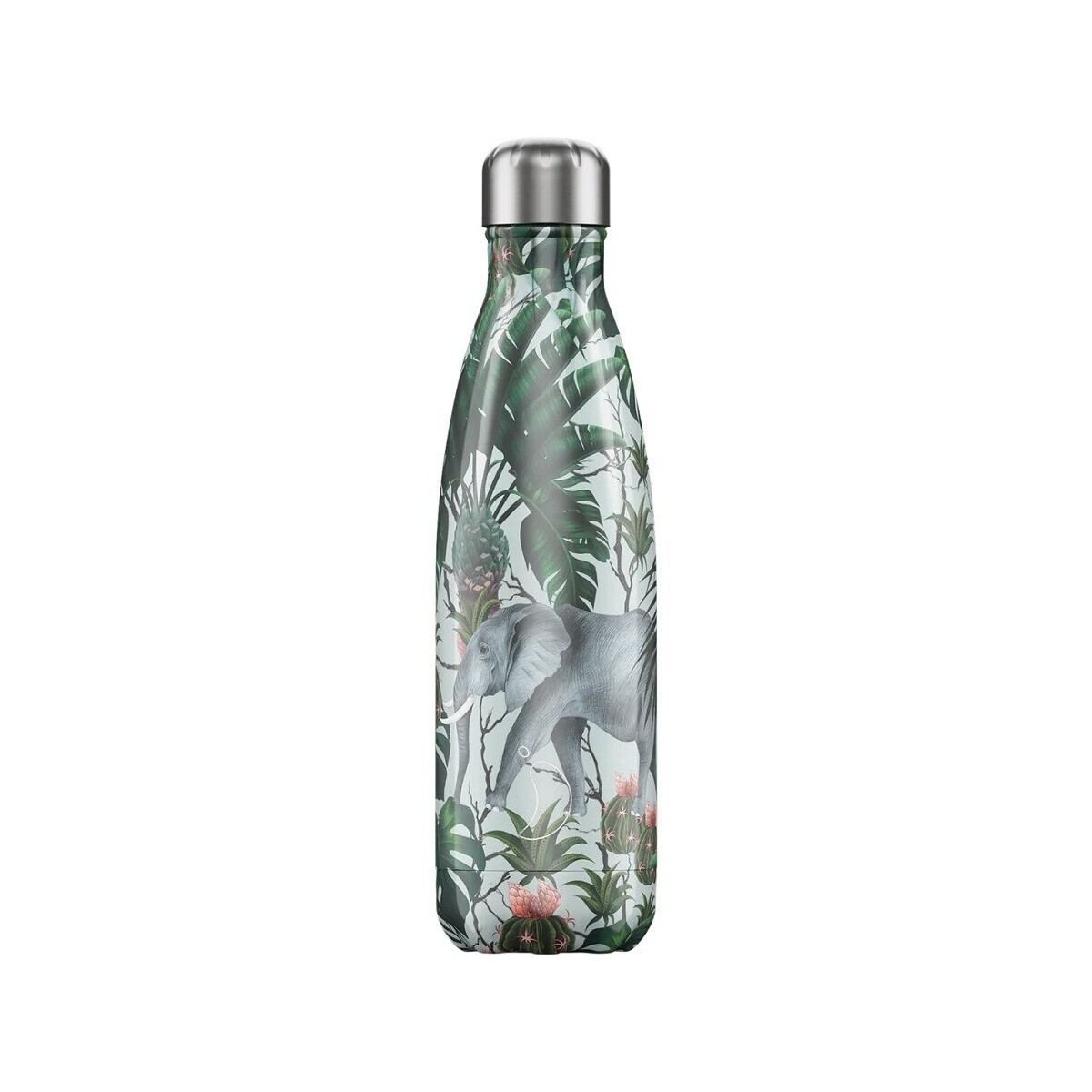 Wiederverwendbare Thermoflasche aus der Tropicale-Kollektion in hellgrüner Farbe mit Blättern und Elefanten und silbernem Schraubverschluss, Fassungsvermögen 500 ml, glänzendes Finish.