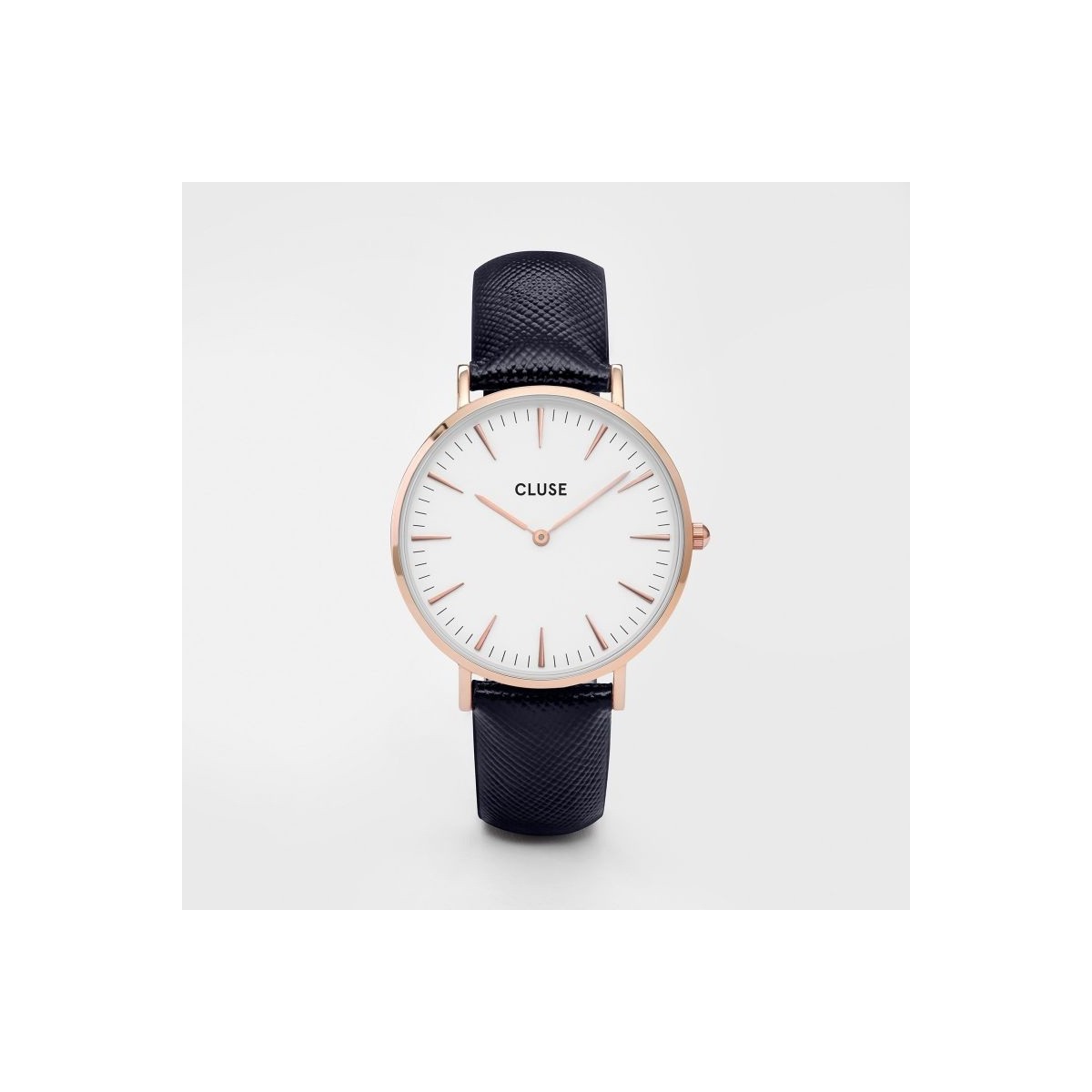 Damenmode Uhrenkollektion La Bohéme mit blauem Lederband, rosa goldbeschichtetem Etui und Schnalle, Quarzwerk, weißes Zifferblatt mit rosa Goldindizes und Händen