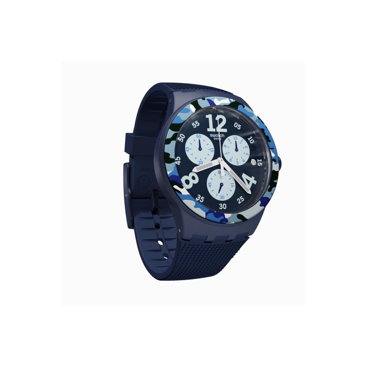 Herrenuhr mit schwarzem Zifferblatt und superluminous Indizes, Datum um 3 Uhr, schwarzer Plastiktarnung und schwarzer und blauer Silikon texturierter Gurt; Quarzwerk