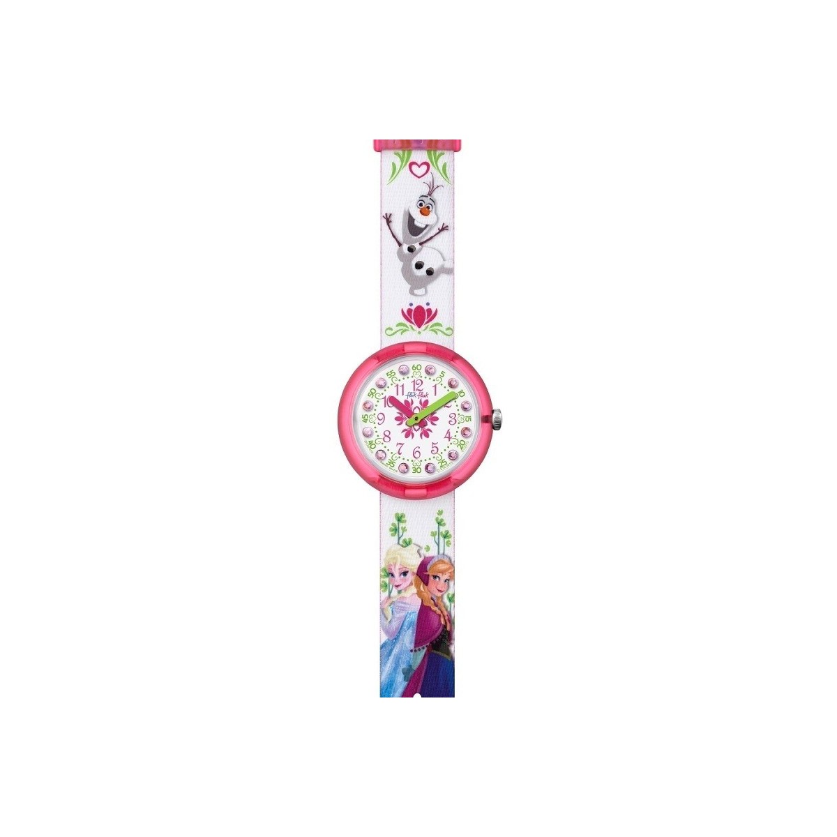 Breite 31.85 mm Dicke: 9.25 mm Höhe: 30.60 mm. Wasserdicht: 3 bar Der gefürchtete ewige Winter schmilzt in einer Welt der Blumen und funkelnden rosa Edelsteine, mit aufstrebenden Prinzessinnen um die Welt, die Mädchenmacht und Freundschaft feiern. In der Nähe der mehrjährigen schneebedeckten Schweizer Berge produziert, ist diese kleine Mädchenuhr eine Hymne zum Frühling. Und auch der Schneemann Olaf genießt die Sonne.