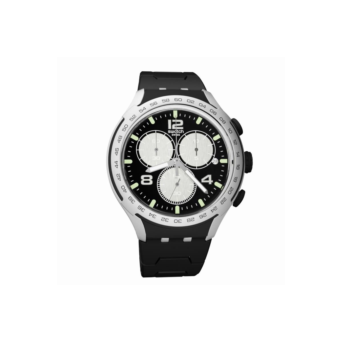 Man's Uhr drei Mini-Silber Zifferblatt mit schwarzen und superluminous Indizes, Datum um 3 Uhr und superluminous Hände. Silber silbernes Gehäuse mit schwarzer Lünette und Lünette; einstellbares eloxiertes Aluminiumband