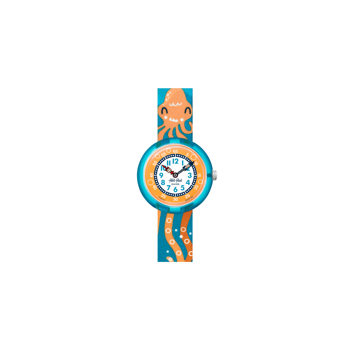 Lernuhr für Kinder mit Ten Tickles aus der Flik Flak Magical Ocean Kollektion. Mit orangefarbenem Zifferblatt und grünem Gehäuse und Armband mit türkisfarbenen und orangefarbenen Oktopussen.