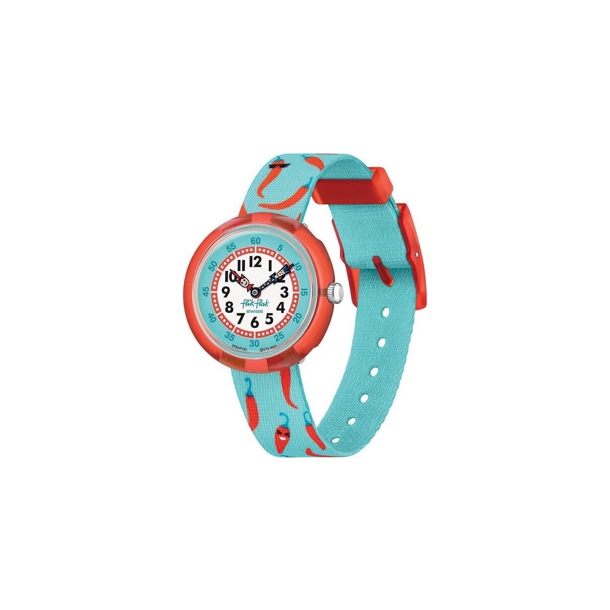 Flik Flak Uhr für Kinder Happy Chilli mit hellblauem Stoffarmband mit Chilis.